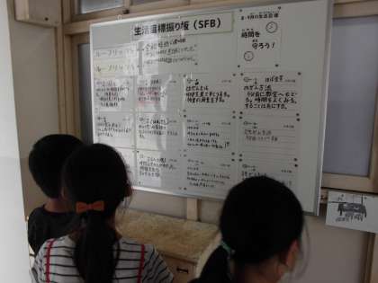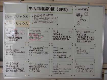 毎月の生活目標をどこまで達成できているかを、月に2回、子どもたち自身が自己評価します。全学年分を職員室前に掲示し、情報共有しています。