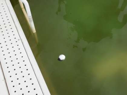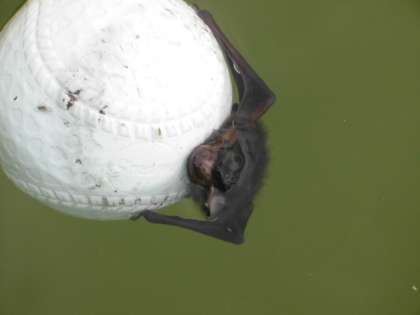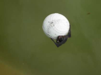 どのようなストーリーでこうなったのか。おぼれたコウモリが藁をもつかむ思いでしがみついたのが、屋上のプールにたまたま飛んできた野球ボールだった、ということでしょうか。何とも不可思議です。