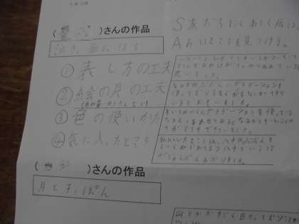 4年生では、思考ツールを使い、四つの視点から図画作品を鑑賞し、自分が佳作と選んだ理由をまとめ交流しました。