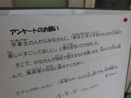 朝会で話に上がった寄付金は、子どもたちが楽しい学校生活を過ごすことができるように、という思いと共にいただきました。