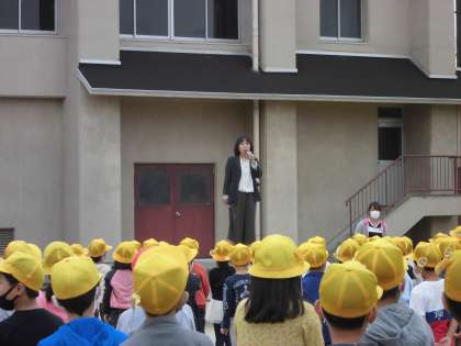 校長先生からは、奉仕活動をして近隣の方からほめてもらった本校児童のお話があり、看護当番の先生からは、みんなで使う遊具は気付いた人が気付いたときに片付けられるようになりたいですね、というお話がありました。