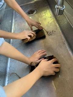 ガスバーナーで木を焼き、そのあと水をかけてたわしでこすります。