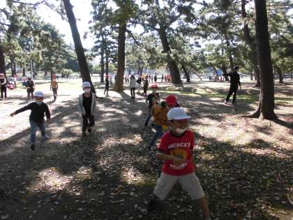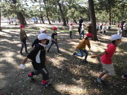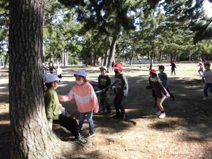 秋の自然を観察しながら、「だーるまさんが こーろんだ!」