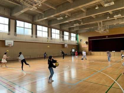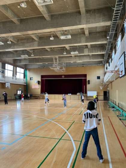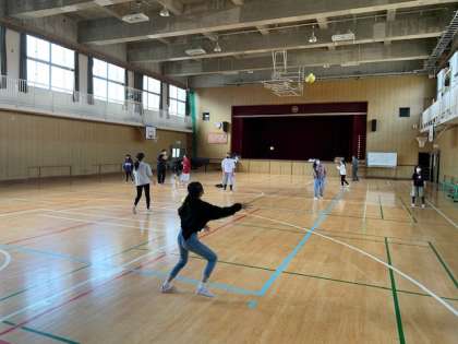 昼休みの講堂では女子チームのメンバーが遠投の練習をしていました。