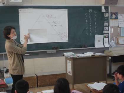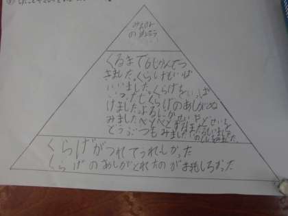 国語科の授業でつながりのある文章を書くためにピラミッドチャートを使い、書く内容を順序立てて、整理していきました。