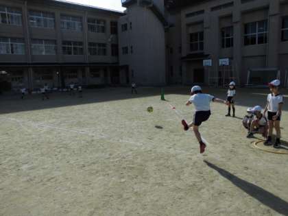 体育でキックベースをしている2年生が一つの寒さ対策を教えてくれています。