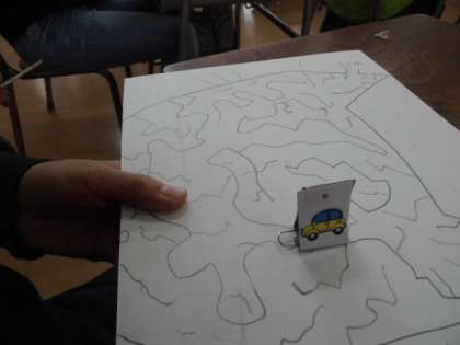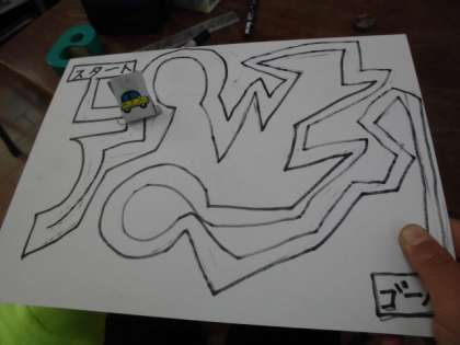 迷路を描いたら、クリップをつけた車の台紙を置きます。