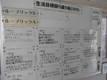 SFB。生活目標振り返り版。職員室前の廊下に掲示しています。