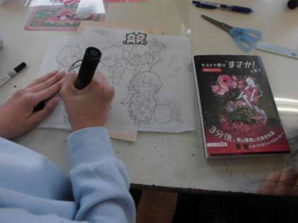 好きなキャラクターなどのイラストをプラスチックのキャンバスに描きます。