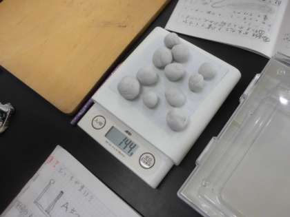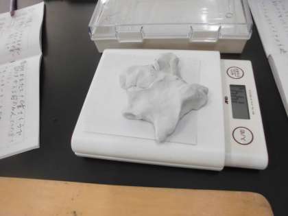 粘土をいろいろな形に変えながら電子秤で重さを調べていきました。
