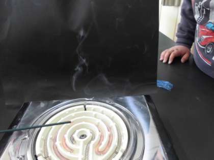 床付近の温度と高い場所の温度を比べたり、線香のけむりの動き方を観察したりしながら、あたためられた空気がどのように動くのかについて考えました。