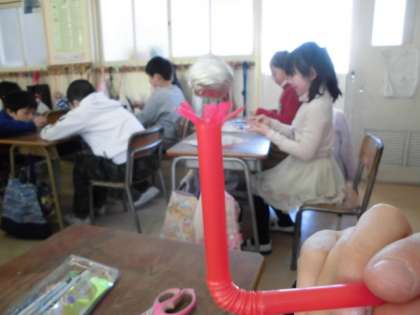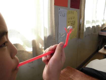 一発目はストローとアルミはくを使ったふーふー玉浮かし。