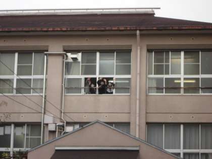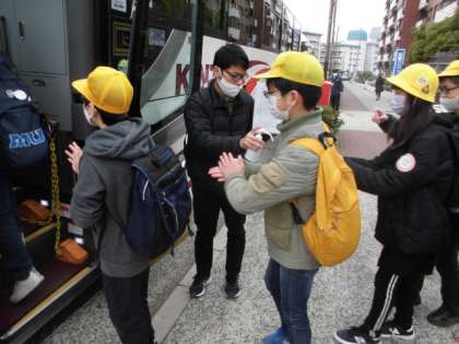 乗車前には手指の消毒、校舎の3階からは5年生のお見送り。