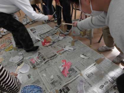たくさんの魚や海の生き物を画用紙でつくり、できた作品にゼムクリップを装着します。
