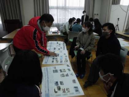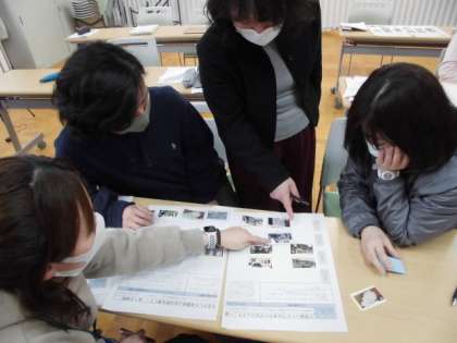自然な学習の流れを作る上で一つひとつの学習活動をどのように捉えて次の学習活動につなげていくのかについて、ワークショップ型の話し合いを通じて研修しました。