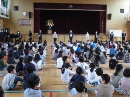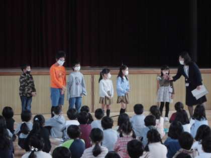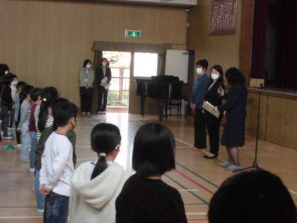 校長先生のリードの下、転入生の子どもたちは全校児童の前で自己紹介をしました。