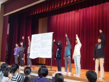 今朝の児童集会では、3月7日(土)に行われる卒業を祝う会に向けての歌の練習を行いました。