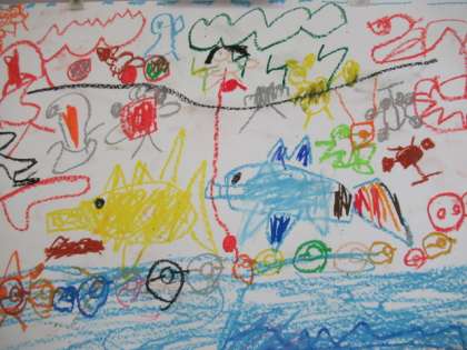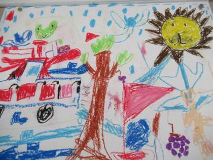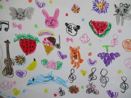 1年生の教室に、自分の好きなものを画用紙いっぱいに描いた絵が掲示されています。