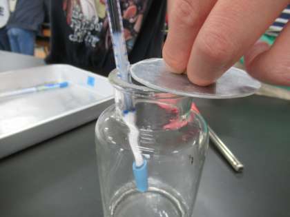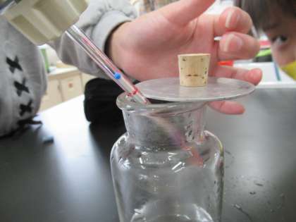 ろうそくの火が消えたら、気体検知管を挿し込み、瓶内の気体(酸素・二酸化炭素)濃度を測ります。
