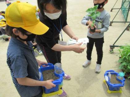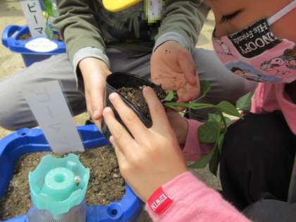 小さなビニルポットから苗を出して、チューリップを植えていたポットに引越しさせるのですが、子どもたちなかなかの悪戦苦闘ぶりでした。