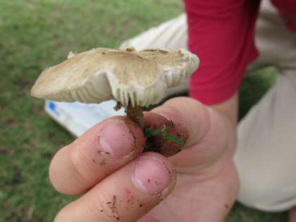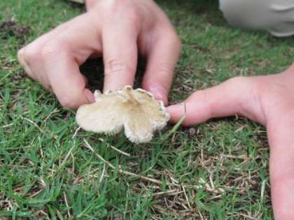 高学年のとある男の子が、昼休みに築山でキノコを発見したとのことで、一緒に見に行きました。