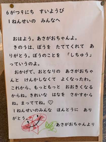 子どもたちが支柱を立ててくれたことがうれしかったそうです。