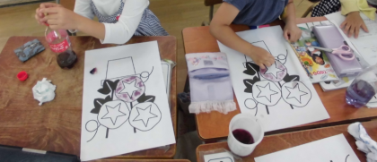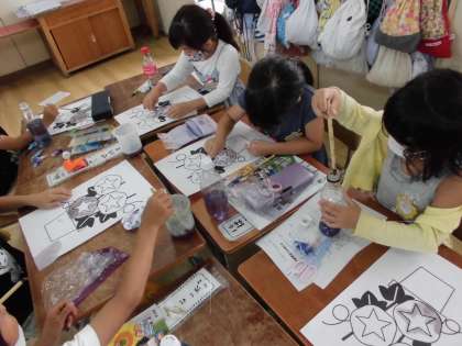 色鮮やかなアサガオのしぼり汁で色つけをしたアサガオの絵も、また趣があります。