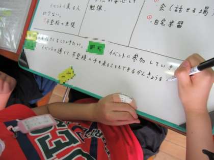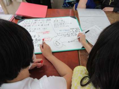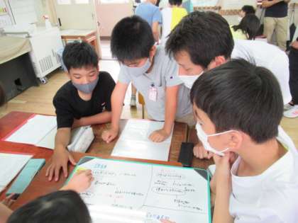 ウェビングマップなどを使って、区長から聞いたことがらを整理する中で、新たな意見が生み出されていきます。友だちの考えに触れて自分の考えを変えていくことを目標に据えながら、グループの意見をまとめていきました。