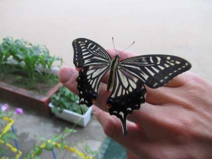 夕刻、逃がす際しばらく撮影者の指に留まり、羽を開いたり閉じたりしていましたが、しばらくすると雨上がりの梅雨空に向かって、ゆっくりと飛び去っていきました。