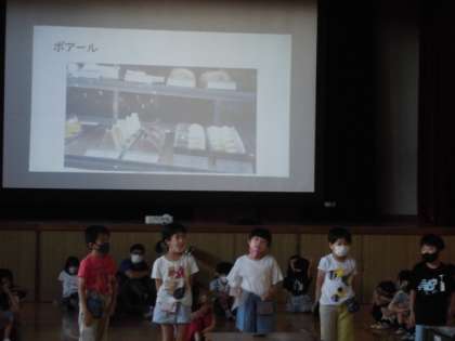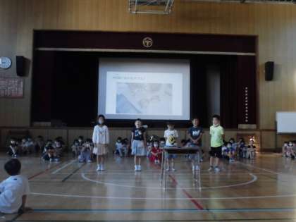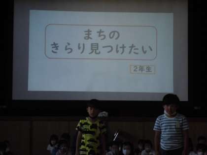 1学期に生活科で行った町たんけんについて、グループ毎に見聞してきたことを全校に向けて発表しました。