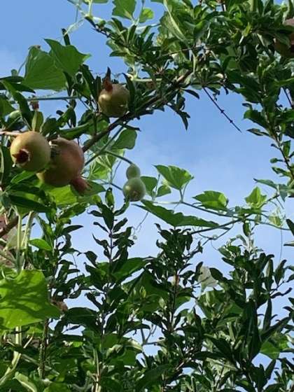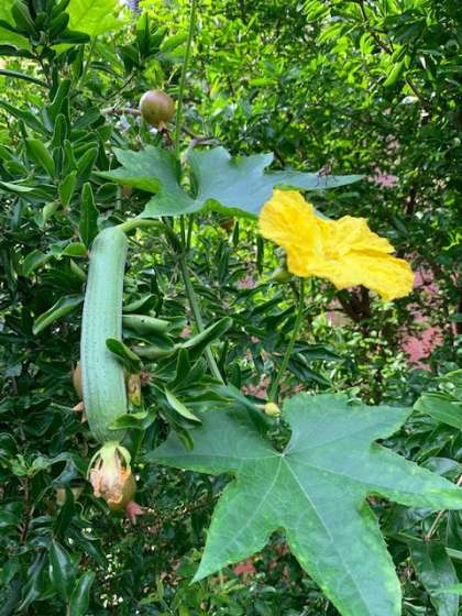学習園で生育中のヘチマとヒョウタンは隣りに生えるザクロの枝まで茎を伸ばし続けています。