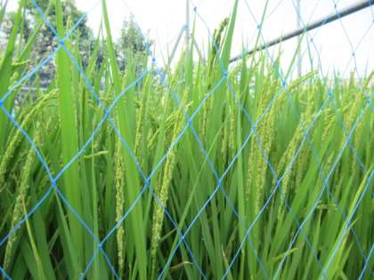 ・稲には穂がついています。鳥よけもバッチリの状態で豊作の予感です。
