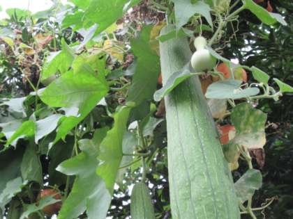 以前お伝えしたヘチマとヒョウタンとザクロの共生ですが、それぞれに育ってきたことで、互いに絡み合って何とも奇妙な様相を呈しています。