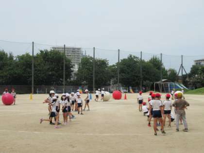 体育の時間、運動場では巨大な玉が子どもたちと一緒に走っていました。