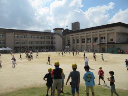 15分休み、築山の上から運動場を一望してみました。青空の下には子どもたちの駆け回る姿がよく似合います。