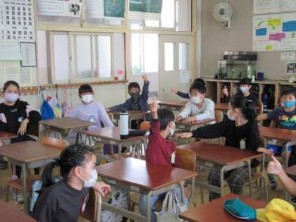 集会委員の放送を聞いて〇×クイズに答えます。