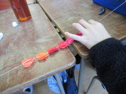 先週土曜日にたて割り班でつくった折り鶴を使い千羽鶴をつくりました。