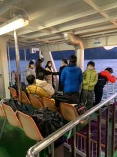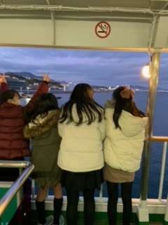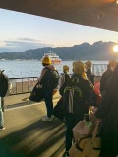 大阪から到着したバスに乗って、宿舎のある宮島に向かいます。