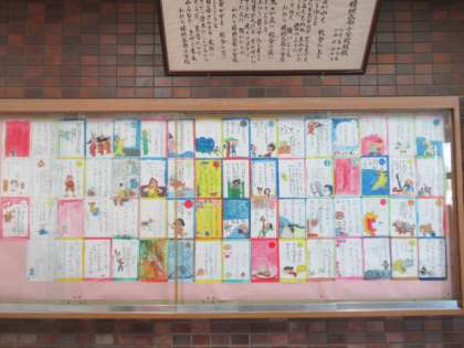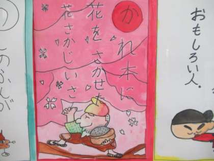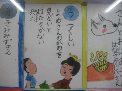 2月の玄関掲示に登場したのは2年生が作成した「昔話かるた」。