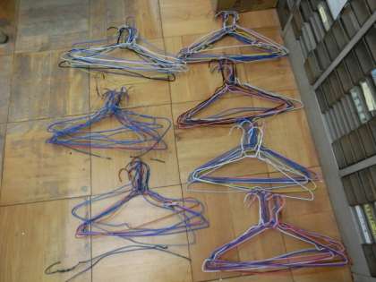 卵、ひな鳥がいないのを確認して(もちろん住人の外出中に)取り除いてみると、針金ハンガーが山のようにありました。