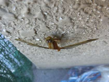 職員室前の壁につかまり、一匹のトンボが羽化していました。