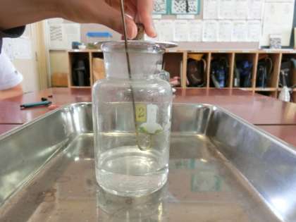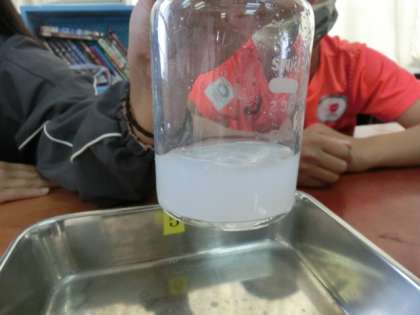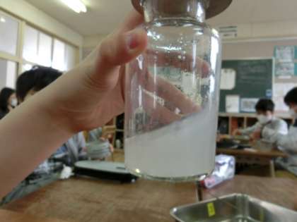 ろうそくを燃やしたあとのビンの中の空気とある物を反応させると、白くにごります。