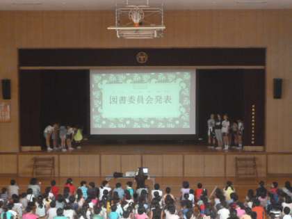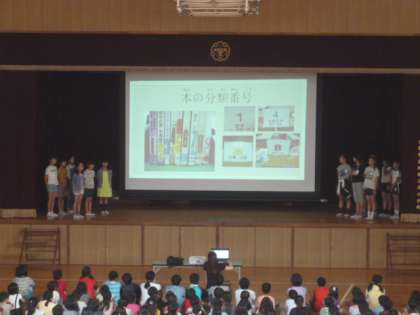 本日の児童集会で、図書委員会の発表がありました。図書室の本には分類番号があり、その番号を探せば、自分の目的の本が見つけやすくなることや、火曜日の休み時間に本の貸し出しをしていることなどを紹介しました。