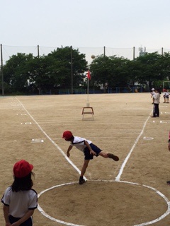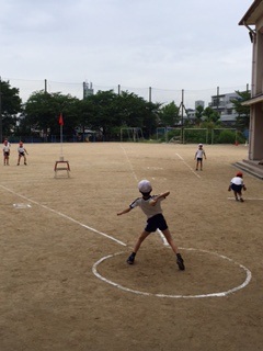 今日は少し雨が降る時間がありましたが、1〜5年生の児童は運動場でソフトボール投げを測定しました。ボールをしっかり握って、赤い旗よりも高く投げるようにみんな一生懸命投げていました。