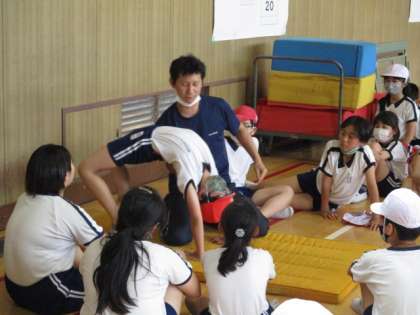 5年生のマット運動の様子を覗きに行くと、倒立ブリッジの指導中でした。