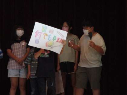 6年2組はいろんな物をラケットに見立て、なんでも卓球を出店します。