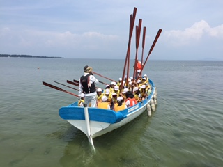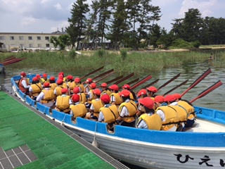 1本のかいを2人で持ち、クラス全員で協力して漕がないとうまく前に進みません。