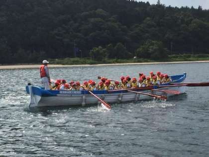 スキッパー(カッターの船長)の指示に従って、みんなの息をそろえてかいをこいでいます。約9メートルもあるカッターをクラス全員の気持ちを一つにして進めます。