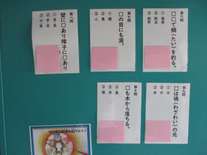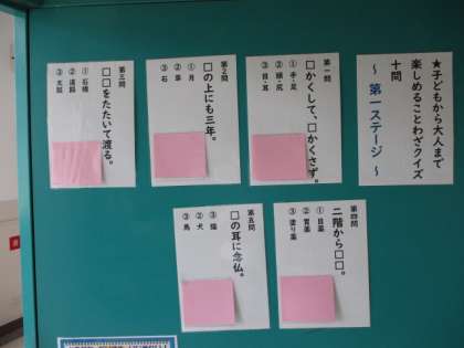 階段付近の防火扉に「こどもからから大人まで楽しめることわざクイズ十問」が掲示されていました。