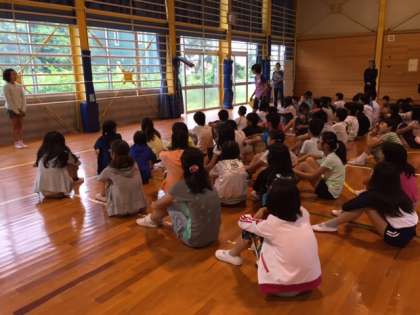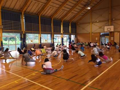 2日目の朝、少し雨が降っていたので体育館で朝の集いをしました。今日の予定の確認と体操をしました。今日は、天候のようすをみながらプログラムを変更しなければならないかもしれません。